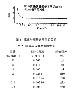 由EMF的測量原理可知,其流量的下限由同噪聲或偏移的信噪比S/N 來決定,其上限則由測量管內(nèi)襯里的磨損和配管的經(jīng)濟速度等來決定。一般當測量管內(nèi)實際流速小于0.1m/s時,感應(yīng)電動勢已變得十分微弱(幾微伏至零點幾微伏),此時噪聲的影響逐步變?yōu)橹鲗?,甚至淹沒信號電動勢。其流速和測量誤差的關(guān)系詳見圖 5和表2。