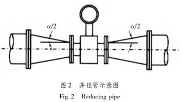 (12)當管道內流速偏低,工藝流量又較穩(wěn)定,為滿足儀表對流速范圍的要求,在儀表部分局部提報流速,可選擇流量計口徑小于工藝管道,并在流量計的前后加接異徑管。為了在安裝異徑管后不過多影響流場分布,不影響污水流量計的精度,要求異徑管的中心錐角α不大于15°,越小越好。這樣可把異徑管視為直管段的一部分。