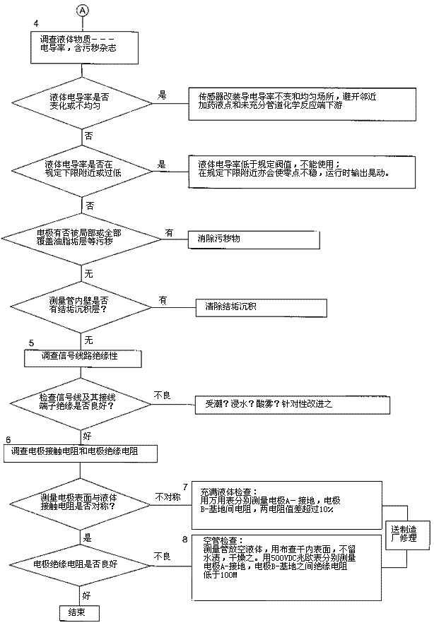 檢查流程圖*5項。信號回路絕緣下降會形成零點(diǎn)不穩(wěn)。信號回路絕緣下降的土要原因足,包極部位絕緣下降所引起的,但也不能排除信號電纜及其接線端子絕緣下降或破壞。因為有時候現(xiàn)場環(huán)境十分嚴(yán)酷,稍一疏忽儀表蓋、導(dǎo)線連接處密封不慎,彌漫著潮氣酸霧或粉粒塵埃侵入儀表接線盒或電纜保護(hù)層,使絕緣卜降。信號回路絕緣電阻檢查分別按電纜側(cè)和流量傳感器側(cè)兩郵分進(jìn)行,用兆歐表測試。因信號電纜容易可先做。流量傳感器再分兩次進(jìn)行:充滿液體測黽電極表面接觸電阻和個管后測量,U極絕緣電阻。