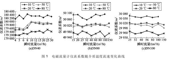 (1) 隨著介質溫度的升高,耐腐蝕排污管道流量計的儀表系數均呈逐漸降低的趨勢。其中20℃和50℃的儀表系數基本相同,10℃和80℃的儀表系數與20℃時偏離較大。