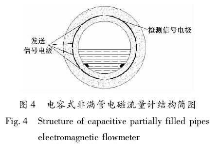 ②電容式非滿管軟化水流量計h。電容式非滿管軟化水流量計結構簡圖如圖4所示。、檢測信號電極 發(fā)送信號電