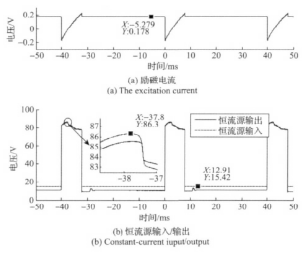 由圖7曲線結合圖2可知,在勵磁方向切換后,檢流電路檢測到的圖7(a)中的勵磁電流瞬間為負,此時勵磁線圈處于電能泄放狀態(tài)并向能量反饋電路中的儲能電容充電。由于儲能電容充電,高、低壓切換電路的輸出電壓從80V逐漸升高;待勵磁線圈能量泄放完即勵磁電流為零時,儲能電容兩端電壓達到*高86V并開始放電,勵磁電流開始上升;儲能電容電壓降低至80V時,高低壓切換電路趨于80V的穩(wěn)定輸出狀態(tài),此時勵磁電流繼續(xù)上升;待勵磁電流上升至設定的超調(diào)量205 mA后,遲滯比較電路控制高低壓切換電路切換至17V低壓源作為勵磁工作電源,恒流電路在17V低壓源輸入下進行恒流控制輸出。