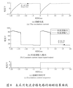 實驗結果表明,高壓源向低壓源切換后,三端穩(wěn)壓器的工作特性致使的電流波動和低壓源供電情況下的恒流控制,會大幅延長勵磁電流的穩(wěn)態(tài)響應時間。圖8所示勵磁電流約在17ms左右進入穩(wěn)態(tài),圖9所示勵磁電流的穩(wěn)態(tài)響應時間約為12ms。這表明,在采用三端穩(wěn)壓器搭建恒流控制電路的情況下,電流旁路電路能有效克服三端穩(wěn)壓器工作特性的影響,并能方便的實現(xiàn)電流超調(diào),加快勵磁電流的響應速度。