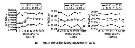將實(shí)驗(yàn)測(cè)得的電磁流量計(jì)dn350在不同溫度及流速下的儀表系數(shù)數(shù)據(jù)整理,特性曲線如圖1所示,3組曲線分別對(duì)應(yīng)DN40, DN80, DN100的3塊電磁流量計(jì)dn350的儀表系數(shù)曲線。