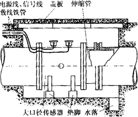 由于大口徑管道在多數(shù)場合下是埋在地下的,因此大口徑傳感器在安裝前應(yīng)做好水泥地坑。圖6-19所示是在給排水系統(tǒng)中常見的安裝形式。水泥地坑應(yīng)有足夠的活動空間,側(cè)壁埋有敷設(shè)電纜的鋼管,上有蓋板防止雨淋,下有泄水管以免坑內(nèi)積水而使傳感器侵水。為了拆裝方便,傳感器應(yīng)放在墊腳上,且在下游側(cè)裝有活絡(luò)的伸縮管。圖6-20是測量鹽水流量計在地下水泥管污水排放系統(tǒng)中的安裝實例。