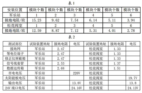 接地網(wǎng)的安裝與連接:接地網(wǎng)是整個重油流量計(jì)防雷試驗(yàn)比較關(guān)鍵的一個內(nèi)容,能不能準(zhǔn)確的論證試驗(yàn)的有效性,必須保證接地網(wǎng)達(dá)到標(biāo)準(zhǔn)的接地電阻,通過對實(shí)地地電阻率的測試,初步選擇6個接地模塊埋設(shè)并配用降阻劑使用,邊安裝邊測試直到達(dá)到標(biāo)準(zhǔn)值后才引入等電位箱。在軍樂站和松花閥室安裝模塊并測試數(shù)據(jù)見表1。