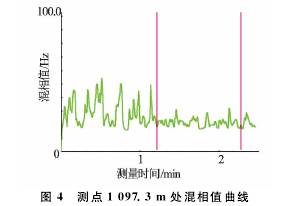 T-××-××1井是大慶油田采油五廠1口水驅(qū)產(chǎn)出井,采用阻抗式含水率計(jì)在該井進(jìn)行了測(cè)試。圖3、圖4分別為測(cè)點(diǎn)深度1097.3m測(cè)量的流量及混相值曲線圖。2min的采樣時(shí)間內(nèi),流量及混相值曲線波動(dòng)劇烈,明顯受井下產(chǎn)氣影響,進(jìn)行平均值計(jì)算時(shí)只能取后半段較平穩(wěn)的數(shù)據(jù),因此,測(cè)試時(shí)需延長測(cè)量時(shí)間。錄取不同范圍數(shù)值時(shí)流量及含水率測(cè)量差值較大,流量平穩(wěn)段為14.81m3/d,高值時(shí)達(dá)到23.52m3/d;取不同測(cè)量段的混相值時(shí)測(cè)量含水率*大相差12%。重復(fù)測(cè)量得到了相同的測(cè)量結(jié)果。由此可見,氣體對(duì)流量及含水率測(cè)量產(chǎn)生了非常大的測(cè)量誤差。