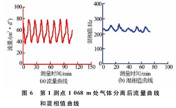 B2-××-××2井是大慶油田采油一廠1口水驅(qū)產(chǎn)出井,該井井口計(jì)量產(chǎn)液51.72m3/d,取樣化驗(yàn)含水率81.8%。采用阻抗式含水率計(jì)在該井進(jìn)行了測(cè)試,圖5為*1測(cè)點(diǎn)深度1068m測(cè)量的流量及混相值曲線圖。圖5的流量曲線表明,流量曲線受氣體影響較大,測(cè)量流量波動(dòng)較大,在25~98m3/d之間波動(dòng),平均值為58.6m3/d;混相值波動(dòng)也很大,在280~640Hz之間劇烈波動(dòng),平均值圖5*1測(cè)點(diǎn)1068m處流量曲線和混相值曲線388Hz。該井測(cè)量流量為65.8m3/d,測(cè)量含水為51.3%,受井下產(chǎn)氣影響明顯,測(cè)量流量明顯高于井口計(jì)量流量,測(cè)量含水率明顯低于化驗(yàn)含水率。同時(shí),在該井測(cè)井時(shí),使用了儀器上裝有氣體分離器的阻抗式含水率計(jì)在該井進(jìn)行測(cè)試,*1測(cè)點(diǎn)的流量及混相值曲線見圖6。由于氣體分離器將氣體分離,未進(jìn)入測(cè)量通道,減小了氣體對(duì)測(cè)量傳感器的影響,測(cè)量的流量及混相值曲線波動(dòng)明顯減少,流量波動(dòng)為36~78m3/d,平均值為55m3/d;混相值波動(dòng)為211~288Hz,平均值為228Hz。測(cè)量流量為54.8m3/d,測(cè)量含水率為80.4%,與井口計(jì)量非常接近。對(duì)比測(cè)量結(jié)果表明,氣體對(duì)流量及含水率測(cè)量造成了非常大的測(cè)量誤差,已不能進(jìn)行準(zhǔn)確測(cè)量。