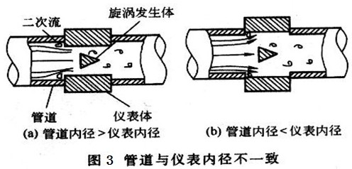 丙烷流量計(jì)與安裝管道內(nèi)徑也會存在誤差,或大或小,如圖3所示,當(dāng)被測介質(zhì)經(jīng)過時(shí),也會發(fā)生二次流動,對測量結(jié)果產(chǎn)生波動影響。