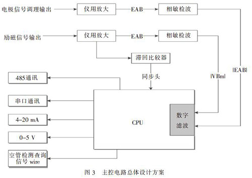 電極檢測出的微弱感應(yīng)電動(dòng)勢E, 先經(jīng)前置放大器的放大和噪聲抑制而成為大幅度低阻抗的電壓信號(hào)。此信號(hào)經(jīng)相敏檢波后,給CPU 進(jìn)行數(shù)字濾波、處理和控制,通過利用雙線性變換法將模擬的二階巴特沃斯低通濾波器轉(zhuǎn)換為數(shù)字式濾波器,既簡化電路設(shè)計(jì),且可靠性高、穩(wěn)定性好。通過編寫軟件CPU 能對(duì)放大器的溫度漂移及零點(diǎn)漂移給予補(bǔ)償, 并在測量的全量程范圍內(nèi)分10 段對(duì)信號(hào)進(jìn)行非線性修正,使得測量值更好地?cái)M合真實(shí)數(shù)據(jù)??展軝z測電路上,CPU 作為從控制器。當(dāng)主控制電路上發(fā)出空管檢測查詢信號(hào)wire, 從控制器進(jìn)行識(shí)別后接收并判斷出查詢什么信號(hào),然后產(chǎn)生應(yīng)答信號(hào)上傳至主控芯片輸出顯示;當(dāng)檢測為空管信號(hào)時(shí), 從CPU 發(fā)出的zero 信號(hào)通過控制MOS 管開關(guān)來關(guān)斷流速輸出。在應(yīng)用中,對(duì)于微弱信號(hào)的放大及提取還需注意PCB 板設(shè)計(jì)時(shí)EMI 電磁屏蔽考慮,屏蔽來自空間磁場的干擾、周邊設(shè)備的輻射造成的干擾和板內(nèi)之間的干擾,如數(shù)模分離、強(qiáng)弱電分離等等。