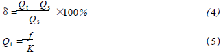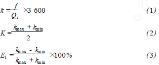 乙烯流量計(jì)在標(biāo)準(zhǔn)水裝置上,分別用頻譜分析和脈沖計(jì)數(shù)的方法進(jìn)行標(biāo)定,流體介質(zhì)為水未加氣體,采用的標(biāo)準(zhǔn)傳感器為精度等級(jí)為0.2級(jí)的電磁流量計(jì)。在每個(gè)流量測(cè)量點(diǎn)上的儀表系數(shù)用公式(1)計(jì)算,然后用式(2)計(jì)算得到*終儀表系數(shù)K。Ql為被測(cè)水的流量值,f為每一個(gè)流量點(diǎn)得到的頻率,k為每個(gè)測(cè)量點(diǎn)得到的儀表系數(shù)。kmax、kmin分別為試驗(yàn)流量范圍內(nèi)得到的*大與*小的儀表系數(shù)。儀表系數(shù)的線性度E1用式(3)來計(jì)算。