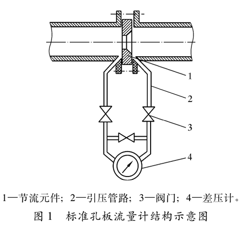 標(biāo)準(zhǔn)管道空氣流量計(jì)結(jié)構(gòu)如圖1所示,包括節(jié)流元件(標(biāo)準(zhǔn)孔板及其取壓裝置)、傳輸壓差信號(hào)的引壓管路、閥門(mén)以及差壓計(jì)等部分。標(biāo)準(zhǔn)孔板是壓差測(cè)量時(shí)的一次元件,人們利用它在管道內(nèi)使流體產(chǎn)生壓差,再通過(guò)引壓管路把孔板前、后產(chǎn)生的壓差傳送給差壓變送器,再輸人到二次儀表,從而顯示出管道內(nèi)流體的靜壓、壓差、瞬時(shí)流量和累計(jì)流量等計(jì)量參數(shù)。