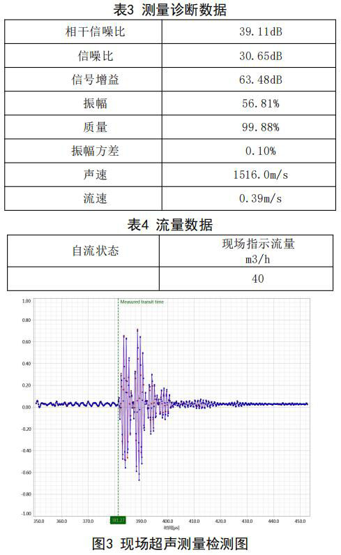 在機組自流補給水狀態(tài):同樣采用德國FLUEX 高精度外夾式超聲波流量計作為標準流量計,測量 基礎數(shù)據(jù):管道外徑276.93mm,管壁厚度12.40mm, 采用兩聲程169mm傳感器安裝距離,通過對超聲波流量計信號分析與診斷(數(shù)據(jù)見表3和表4),超聲 波流量計測量狀態(tài)符合條件,開始測量,打開凝汽 器入口閥門,流量測量情況如下