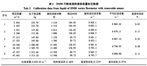 分別用精度0.5級音速噴嘴氣體標定裝置、精度0.2級稱重法水標定裝置對DN50口徑的不斷流渦街進行實際標定,其標定數(shù)據(jù)如表1、表2所示。