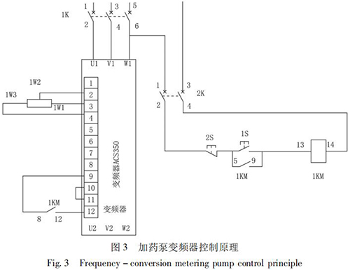 STD - Ⅲ型浮選工藝參數(shù)自動測控系統(tǒng)通過雙膜盒差壓計測量原礦漿濃度; 采用插入式電磁流量計測量原礦漿流量,由 PLC 計算出入浮干煤泥量和藥劑的瞬時添加量,用變頻式計量泵完成浮選藥劑的添加。通過上位機還可以打印小時、班、天及月的運行數(shù)據(jù),更加有利于生產(chǎn)管理及技術(shù)分析,藥劑自動原理如圖 2 所示,k1、k2、k3 是計算修正參數(shù)。以 PID 算法為核心,通過優(yōu)化控制程序計算出藥劑給定量,在捕收劑和起泡劑管道上分別安裝藥劑測量裝置,用于檢測藥劑的添加量。當(dāng)藥劑測量值小于藥劑給定量時,PID 輸出增大,反之則減小。加藥泵變頻器控制原理如圖 3 所示。