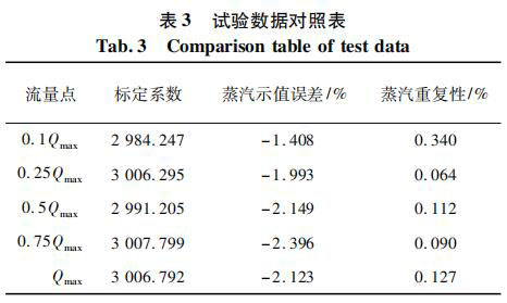 為了進行比對,下文再以蒸汽為檢定介質(zhì),重復以上流量點的測試。每個流量點的檢測次數(shù)增加為 3 次,每次持續(xù)時間為 1 min。該檢定裝置采用冷凝稱重法,介質(zhì)為過熱空氣,流量范圍 0. 01 ~ 30 t / h,對 應 的 擴 展 不確定度為 U =0. 1% ( k = 2) 。