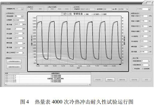 本文研究的 4000 次冷熱沖擊試驗的實現(xiàn)具有以下特點: (1)基于“工控機 +水泵 + 煤油流量計”的閉環(huán)控制系統(tǒng),實現(xiàn)了流量自動反饋調(diào)節(jié),滿足試驗要求; (2)通過四個開關(guān)閥的時序切換,自動控制試驗溫度,很好的完成了 4000 次溫度沖擊試驗; (3)通過“工控機 + 數(shù)據(jù)數(shù)據(jù)采集卡”的數(shù)據(jù)采集系統(tǒng),實時監(jiān)控試驗過程中的流量、溫度、壓力等相關(guān)參數(shù),實現(xiàn)試驗方式的自動控制,并能對試驗數(shù)據(jù)進行分析與評定。 (4)試驗的全過程為智能自動化,可無人員留守看護。試驗結(jié)果可直接反映出熱量表在長時間運行后的可靠性。為我國熱量表耐久性試驗研究提供檢測手段,為促進產(chǎn)品質(zhì)量提升做好技術(shù)保障。