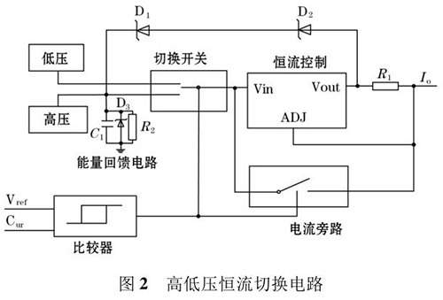 高頻勵(lì)磁電路主要由高低壓切換恒流控制電路和H 橋勵(lì)磁開(kāi)關(guān)電路組成。其中高低壓切換恒流控制電路確保高壓或低壓情況,都可以通過(guò) H 橋向勵(lì)磁線(xiàn)圈提供恒定的電流。電路原理圖如圖 2所示。