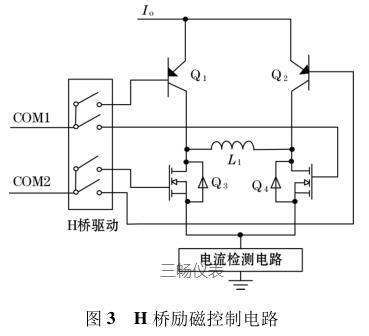 由圖 3 可知,I o 為高低壓切換恒流控制電路輸出的恒流源電流,H 橋驅(qū)動(dòng)的 COM1 端控制三極管 Q 1和場(chǎng)效應(yīng)管 Q 4 的通斷;COM2 端控制三極管 Q 2 和場(chǎng)效應(yīng)管 Q 3 的通斷。L 1 表示的是勵(lì)磁線(xiàn)圈(傳感器中線(xiàn)圈),COM1、COM2 為正交的 PWM 波信號(hào),因此在勵(lì)磁線(xiàn)圈 L 1 的兩端會(huì)產(chǎn)生方波勵(lì)磁信號(hào)。檢流電路主要是用來(lái)檢測(cè)勵(lì)磁線(xiàn)圈中電流的變化,當(dāng)線(xiàn)圈中的勵(lì)磁電流方向變化時(shí),可以及時(shí)將此信息反饋給高低壓切換恒流控制電路中的比較器,從而實(shí)現(xiàn)切換高低壓源達(dá)到恒流控制的目的。