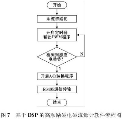 軟件流程圖如圖7 所示。軟件采用模塊化的設(shè)計(jì)方法,主要設(shè)計(jì)了勵(lì)磁控制切換程序、PWM 波產(chǎn)生程序、A/D 轉(zhuǎn)換程序以及 RS485 通信程序等。系統(tǒng)上電后*先執(zhí)行復(fù)位操作,利用 DSP 內(nèi)部的定時(shí)器產(chǎn)生PWM 波控制 H 橋電路中的勵(lì)磁方式,當(dāng)系統(tǒng)檢測(cè)到傳感器線(xiàn)圈輸出的感應(yīng)電動(dòng)勢(shì)后,利用 DSP 內(nèi)部的 12位 A/D 轉(zhuǎn)換器對(duì)此信號(hào)進(jìn)行模數(shù)轉(zhuǎn)換,*后根據(jù)相應(yīng)算法計(jì)算出管道中被測(cè)液體的流量。