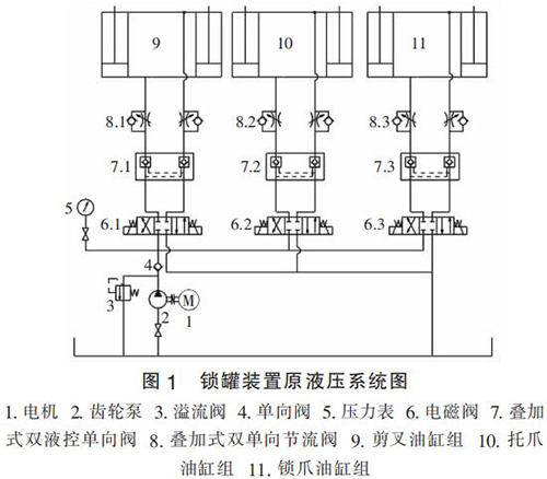 氪氣流量計(jì)原液壓系統(tǒng)圖如圖 1 所示。 通過(guò)分析圖 1 發(fā)現(xiàn),原液壓系統(tǒng)中剪叉油缸組、托爪油缸組及鎖爪油缸組并聯(lián)安裝,并均由齒輪泵供油,該系統(tǒng)設(shè)計(jì)簡(jiǎn)單,液壓元件選擇不夠合理,工作效率低,電機(jī)發(fā)熱大,主要存在的問(wèn)題: