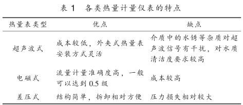 目前供熱行業(yè)內(nèi)使用的熱量計量儀表按工作原理主要分為超聲波式、 電磁式、 差壓式, 其特點見表 1 。 熱量計量儀表按結(jié)構(gòu)可分為一體式和分體式, 一體式熱量表將一支入口或出口溫度傳感器嵌入到流量傳感器管道中, 并配有專門的計算器進行熱量計算; 分體式熱量表采用單獨的流量傳感器, 包括超聲波流量計、 電磁流量計、 差壓流量計、硝酸鈉流量計等, 溫度測量采用單獨的鉑電阻溫度計或溫度變送器測量供回水管道溫度, 再配備熱量積算儀進行溫度和流量信號采集得到熱量值。