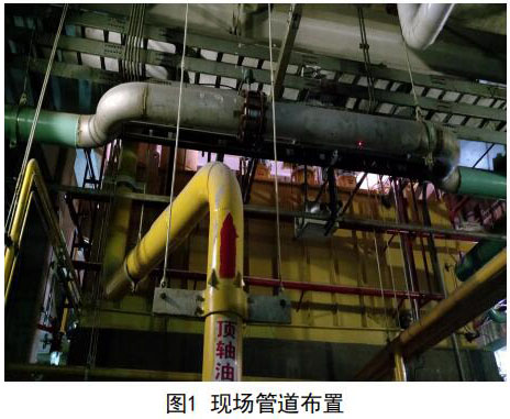 考慮兩臺(tái)機(jī)組管線布置和運(yùn)行狀態(tài)完全一致, 下面僅提供#1機(jī)組的測(cè)量分析。圖1中頂軸油管上 部水平管道為凝結(jié)水補(bǔ)水管道。