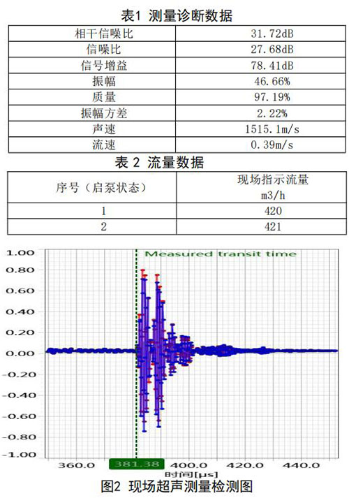 在高負(fù)荷段采用泵送補(bǔ)給水狀態(tài):測(cè)試時(shí)間 2018年10月11日,采用德國(guó)FLUEX高精度外夾式超 聲波流量計(jì)作為標(biāo)準(zhǔn)流量計(jì),測(cè)量基礎(chǔ)數(shù)據(jù):管道 外徑276.93mm,管壁厚度12.40mm,采用兩聲程169mm傳感器安裝距離,通過(guò)對(duì)超聲波流量計(jì)信號(hào) 分析與診斷(數(shù)據(jù)見(jiàn)表1、表2和圖2),診斷數(shù)據(jù) 提示標(biāo)準(zhǔn)超聲波流量計(jì)測(cè)量狀況佳,檢測(cè)開(kāi)始,啟 動(dòng)補(bǔ)給水泵,運(yùn)行一段時(shí)間流量穩(wěn)定后,測(cè)量結(jié)果 如下: