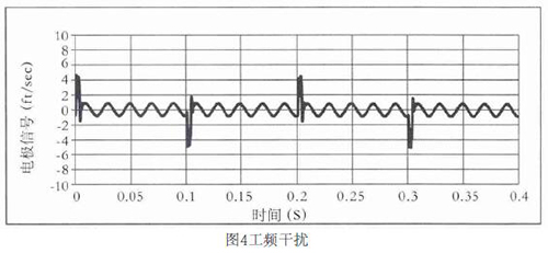 工頻干擾是高壓渦輪流量計常見的干擾源。當(dāng)流量計處于電源形成電磁場中時,由于分布電容的存在,以電磁波的輻射形式干擾電極信號,或者是由供電電源引入的工頻串?dāng)_,工作現(xiàn)場的工頻共模干擾,其產(chǎn)生的物理機理均是電磁感應(yīng)原理。幅度與流量信號相比,往往要大幾個數(shù)量級,頻率與供電電源頻率相同。如圖4所示,線圈驅(qū)動頻率為5Hz的電極信號,被耦合了50Hz的工頻干擾,幅度大概相當(dāng)于1feet/s。