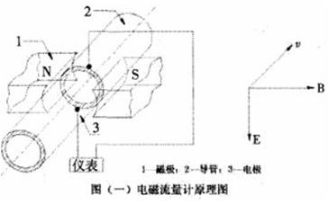 設(shè)在均勻磁場(chǎng)中,垂直于磁場(chǎng)方向有一個(gè)直徑為D的管道。管道由不導(dǎo)磁的材料制成管道內(nèi)表面襯掛絕緣襯里。當(dāng)導(dǎo)電的液體在導(dǎo)管中流動(dòng)時(shí),則導(dǎo)電液體切割磁力線,于是在和磁場(chǎng)及流動(dòng)方向垂直方向上產(chǎn)生感應(yīng)電勢(shì),如安裝一對(duì)電極,則電極間產(chǎn)生和流速成正比例的電勢(shì)差。