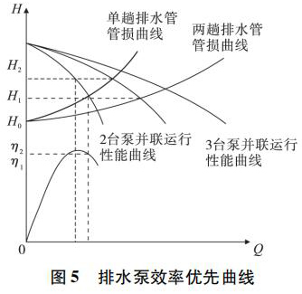 當執(zhí)行多臺排水泵同時運行時,通過排水泵特性曲線與管路特性曲線的比較,選擇非常好的匹配排水泵與排水管數量,保證排水泵在非常好的新效率點運行。如圖 5 所示。
