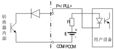 PUL+/ P+、ALM+(AH)、ALM-(AL)和 PDIR(FDIR)均為集電極開(kāi)路(OC 門(mén))輸出(參閱圖 3.6b、3.6d,用戶接線時(shí)必須參照如下電路外接電源和負(fù)載: