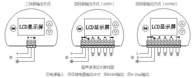 智能超聲波液位計(jì)具有三種輸出方式,在進(jìn)行接線時(shí),請按照下圖所示的接線方式進(jìn)行安全接線。