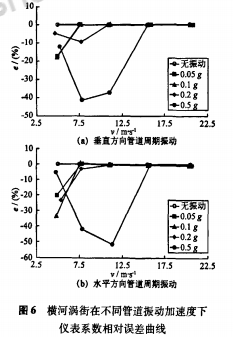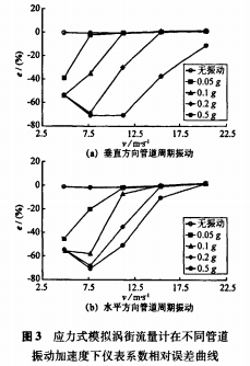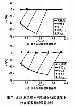 以應(yīng)力式模擬渦街流量計(jì)為被測(cè)對(duì)象,在5m/s、7.5m/s、11m/s、15.5m/s、20.5m/s流速下,分別進(jìn)行了無(wú)振動(dòng)和施加管道周期振動(dòng)的實(shí)流標(biāo)定試驗(yàn)。管道振動(dòng)方向?yàn)榇怪狈较蚝退椒较?,加速度?.05-0.5g。根據(jù)試驗(yàn)數(shù)據(jù),繪制出不同管道振動(dòng)加速度下渦街儀表系數(shù)相對(duì)于無(wú)管道振動(dòng)時(shí)平均儀表系數(shù)的相對(duì)誤差曲線,垂直方向結(jié)果如圖3(a)所示。