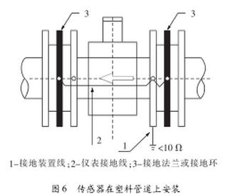 (2)傳感器在塑料管道上或在絕緣襯里的管道上安裝時,如圖6,傳感器兩端必須安裝接地環(huán)或接地法蘭。使管內流動的被測介質與大地短路,具有零電位,否則污水流量計無法正常工作。