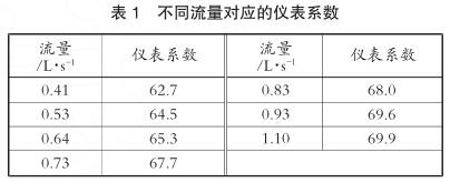 其中自變量為流量,因變量為儀表系數(shù)。當(dāng)流量介于0.4~1L/s時,采用式(1)進行計算;當(dāng)流量超過1.1L/s時,保持儀表系數(shù)恒為69.9。