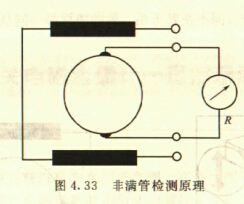 非滿管檢測(cè)也是基于電導(dǎo)率檢側(cè)的方法。在圖4.33所示的電磁流量傳感器中,增加了一個(gè)(或一對(duì))非滿管檢測(cè)電極。當(dāng)導(dǎo)管內(nèi)液體滿管時(shí),頂部電極與其他電極之間的電阻值很小;而當(dāng)存在非滿管情況時(shí),頂部電極與導(dǎo)電液體之間有氣體阻隔,所以電極電阻顯著增大,從而做出非滿管判斷。