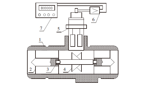 1 殼體,2 前導(dǎo)流板,3 軸承,4 渦輪,5 變送器,6 前置放大器,7二次儀表