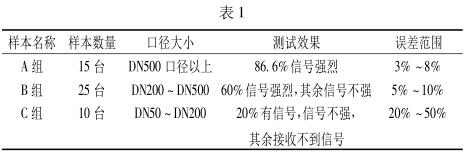 通過大量的在線檢測試驗,可以看出所測管道管徑對超聲流量計測試效果有明顯影響。根據(jù)數(shù)據(jù)顯示,管徑越大,測試效果越好,示值誤差越小。隨著管徑的減小,超聲流量計所能檢測到的流速信號也隨著變?nèi)?,當口徑小?DN50 時,基本沒有信號或是產(chǎn)生巨大的干擾信號。