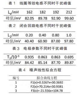 圖 4 為改變勵磁線圈等效電感其它值保持不變時測得的干擾結果,可以看出,當線圈等效電感取值不同時,干擾峰值存在變化,電感越大線圈中電流上升(下降)時間越長,微分干擾越大。圖 5 為改變測量回路等效電感即等價于改變交變磁力線穿過測量回路等效面積時測得的干擾結果, 隨著值增大干擾呈逐漸增大的趨勢。 因此要避免電極走線偏離,盡量保持回路與磁力線平行以減小干擾。