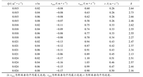 流速沿?cái)嗝娣植嫉木鶆蛱匦钥梢酝ㄟ^流速分布不均勻系數(shù)進(jìn)行表征,通過所選取斷面*大流速和*小流速的差值與該斷面平均流速的比值,δ值越大表明浮體結(jié)構(gòu)的存在對(duì)水流斷面流速的分布產(chǎn)生的影響較大。表2中,當(dāng)來流流量相同時(shí),流速的不均勻系數(shù)多數(shù)隨e的增大而減小。浮體結(jié)構(gòu)位置較小時(shí),主流為浮體結(jié)構(gòu)上部的水流。隨著浮體結(jié)構(gòu)位置的上升,來自上游的水體逐漸分成浮體結(jié)構(gòu)上部和下部的兩股主流,流速分布的不均性減小。浮體結(jié)構(gòu)位置及所處水位條件相同時(shí),來流流量的增大,區(qū)域的平均流速增大,因此流速不均勻性減小。