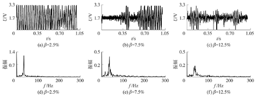 試驗(yàn)發(fā)現(xiàn),氣相的加入對(duì)乙烯流量計(jì)測(cè)量的影響顯著,譜分析和脈沖計(jì)數(shù)兩種方法隨著氣相注入的增加其表現(xiàn)也不同。圖4反映了水流量12m3/h時(shí),注入不同氣含率β時(shí)A點(diǎn)的模擬信號(hào),如圖4(a~c)所示;經(jīng)譜分析后得到的頻率值,如圖4(d~f)所示;用脈沖計(jì)數(shù)方法得到的脈沖信號(hào),如圖4(g~i)所示。圖4顯示,當(dāng)注入氣量不大時(shí),對(duì)乙烯流量計(jì)的影響不大,無論是譜分析結(jié)果還是脈沖計(jì)數(shù)得到的結(jié)果都比較好。當(dāng)注入的氣量進(jìn)一步增加時(shí),渦街原始信號(hào)強(qiáng)度和穩(wěn)定性逐漸變差,渦街頻率信號(hào)會(huì)被干擾信號(hào)所淹沒,反映到譜分析圖是,渦街頻率的譜能量減小,干擾信號(hào)的譜能量加強(qiáng);對(duì)于脈沖信號(hào),會(huì)因?yàn)橐恍┬郎u信號(hào)減弱,形成脈沖缺失現(xiàn)象,而不能真實(shí)地反映渦街產(chǎn)生的頻率。