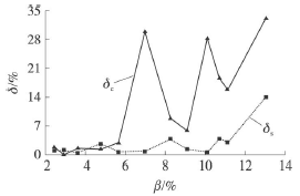 將試驗(yàn)數(shù)據(jù)進(jìn)行處理,得到了乙烯流量計(jì)測(cè)量誤差隨氣相含率變化的情況,如圖5所示。其中δs為譜分析方法的測(cè)量誤差,δc為脈沖計(jì)數(shù)方法的測(cè)量誤差。乙烯流量計(jì)的測(cè)量誤差用式(4)來計(jì)算。其中Qs為裝置中標(biāo)準(zhǔn)表測(cè)量出的管道總流量,Qt為試驗(yàn)管段中乙烯流量計(jì)的測(cè)量值。將譜分析和脈沖計(jì)數(shù)得到的頻率值和儀表系數(shù)分別代入式(5)計(jì)算Qt值。從圖中可以看出氣相含率的增加兩種測(cè)量方法得到的誤差并不相同。當(dāng)含氣率不高時(shí),0<β<6%,譜分析法的平均誤差為1.226%,*大誤差為2.687%,脈沖計(jì)數(shù)法的平均誤差為1.583%,*大誤差為2.898%,因此譜分析法與脈沖計(jì)數(shù)法的測(cè)量誤差區(qū)別不大,譜分析沒有明顯的優(yōu)勢(shì);在氣相含率進(jìn)一步增加時(shí),6%<β<14%,譜分析法的平均誤差為3.975%,*大誤差為14.058%,脈沖計(jì)數(shù)法的平均誤差為20.053%,*大誤差為33.130%,脈沖計(jì)數(shù)的方法得到的測(cè)量誤差遠(yuǎn)大于譜分析方法。