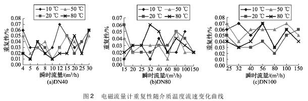 將實(shí)驗(yàn)測得的農(nóng)藥流量計(jì)在不同溫度及流速下的重復(fù)性數(shù)據(jù)整理,特性曲線如圖2所示,3組曲線分別對應(yīng)DN40、DN80、DN100的3塊農(nóng)藥流量計(jì)的重復(fù)性曲線。
