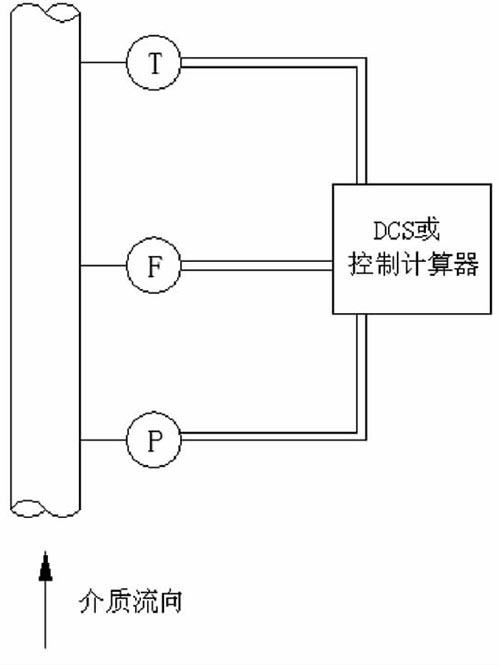 流量計、溫度變送器、壓力變送器單獨安裝,流量信號、溫度信號、壓力信號分別輸入DCS或控制計算器進行流量的溫度、壓力補償計算,完成流量、壓力、溫度各參數(shù)的顯示、輸出、打印等功能。此種結(jié)構(gòu)安裝靈活,特別適用于現(xiàn)場流量計的升級改造,如圖2所示。號、溫度信號、壓力信號輸入到溫壓補償功能設計的流量計轉(zhuǎn)換器中,進行流量的溫度、壓力補償計算,完成流量、壓力、溫度各參數(shù)的顯示、輸出、打印等功能。此種結(jié)構(gòu)測量準確度高,體積小,安裝方便,如圖3所示: