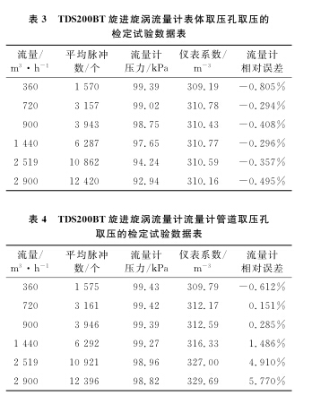 以使用廣泛的DN100B天燃氣流量計為例,系統(tǒng)運行時間為60s,標準裝置的滯止平均溫度為28.9℃,空間平均濕度為30%,流量計的平均溫度為28.3℃,在表體取壓孔取壓和管道取壓孔取壓的流量計檢定試驗數(shù)據(jù)分別如表1、2所示。