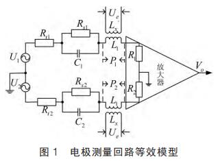 測量電極與流體介質接觸時會發(fā)生電化學反應在電極-溶液界面形成阻抗,通常由法拉*阻抗與雙電層電容并聯組成。 法拉*過程分為電荷傳遞過程和擴散過程,相應的法拉*阻抗由電荷傳遞電阻與擴散阻抗串聯組成。一般硫酸鐵流量計的勵磁頻率大于1Hz,而擴散阻抗發(fā)生在更低頻率內,不考慮擴散過程,電極等效阻抗為電荷傳遞電阻與雙電層電容并聯后再與電極接觸電阻串聯。 基于電極阻抗建立的電極等效測量回路如圖 1 所示。圖中:Rs1 和 Rs2 為電荷傳遞電阻;C1 和 C2 為雙電層電容;Rt為兩個測量電極間的接觸電阻滿足 Rt=Rt1+Rt2;Lx 為勵磁線圈等效電感;L1 為閉合回路等效電感;R1 和 R2 為放大器輸入電阻;P1和 P2 為由“變壓器效應”疊加在測量電極上的微分干擾;U1 為流體切割磁力線產生的感應電勢;Ue 為勵磁電壓。 假設磁感應強度由勵磁電流決定且成正比關系即 B=aI,忽略串模等干擾則電極間電壓為感應電勢與微分干擾的疊加,基本方程如下: