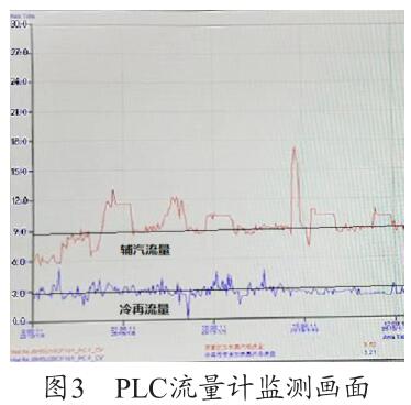 通過圖3可以看出,PLC 上輔汽測量用的煙氣流量計的量程設(shè)置為30t/h,現(xiàn)場設(shè)備量程實際為5t/h,兩者嚴(yán)重不符,因此測量值8.286t/h 為錯誤值,需要對程序進(jìn)行修改。
