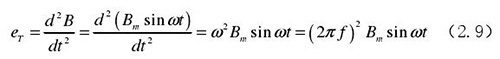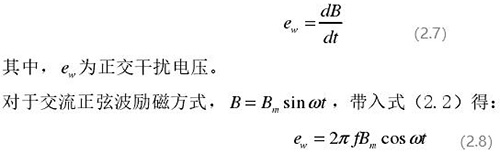 從上圖 2.5 中可以觀察到兩個電極、勵磁線圈、轉換器內阻之間形成了一個閉合回路,將此回路稱之為初級繞組,從理論上進行分析,磁力線 B 應當平行于勵磁線圈所產(chǎn)生的磁感應線,但在實際的應用過程中由于工藝差異,因此無法達到理想狀態(tài),會產(chǎn)生磁力線穿過勵磁線圈磁感應線的情況,此時將會產(chǎn)生相應的感應電動勢,將此部分感應電動勢稱為變壓器效應。此效應同樣滿足于楞次定律,利用楞次定律進行計算可得如下電動勢: