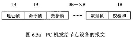 在飲用水流量計(jì)等節(jié)點(diǎn)設(shè)備和C機(jī)通信的過程中,由地址幀、命令幀、數(shù)據(jù)幀、校驗(yàn)和可組成各種功能不同的報(bào)文。由于采用主從工作方式來實(shí)現(xiàn)通信,飲用水流量計(jì)等節(jié)點(diǎn)設(shè)備僅能接收并執(zhí)行PC機(jī)發(fā)送來的控制命令,而不能發(fā)送命令給PC機(jī)。因此,由PC機(jī)發(fā)往流量計(jì)等節(jié)點(diǎn)設(shè)備的報(bào)文一般包括一個地址幀,一個命令幀,若干個數(shù)據(jù)幀和一個校驗(yàn)和,其報(bào)文格式圖.6a5所示;而由流量計(jì)等節(jié)點(diǎn)設(shè)備發(fā)往PC機(jī)的報(bào)文一般包括一個地址幀,若干個數(shù)據(jù)幀和一個校驗(yàn)和,其報(bào)文格式如圖6.5b所示。